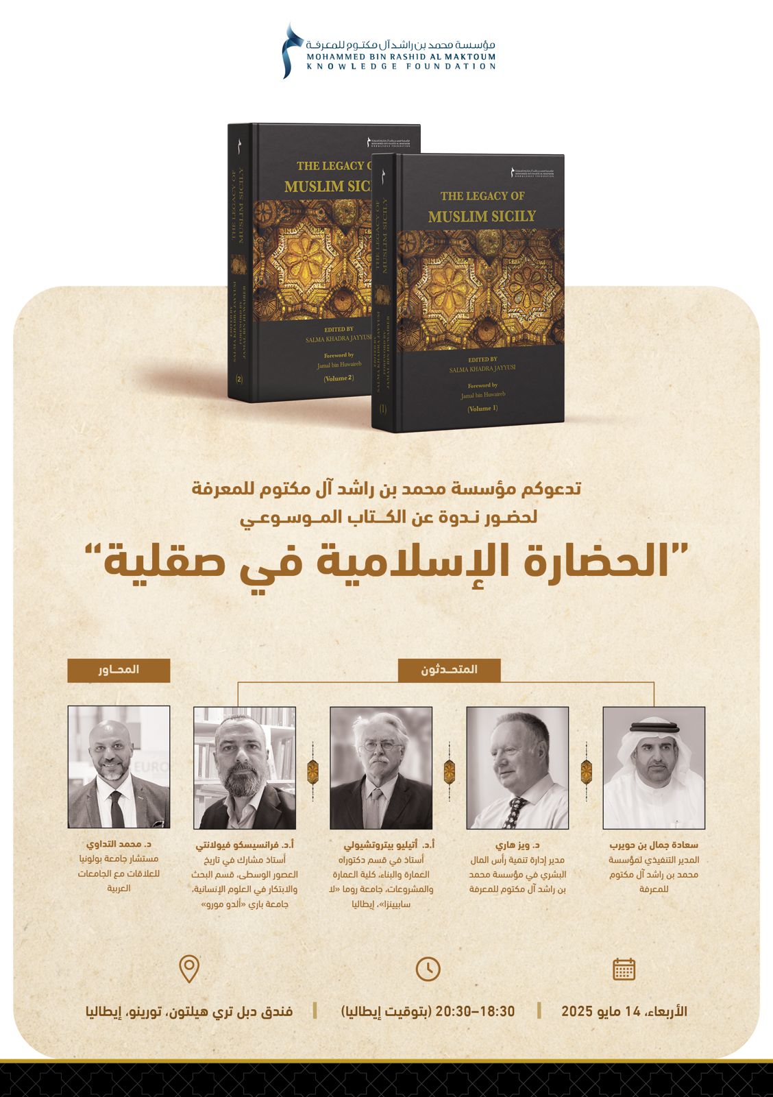 تُنظم مؤسسة محمد بن راشد آل مكتوم للمعرفة ندوة معرفية عن موسوعة "الحضارة الإسلامية في صقلية" بمشاركة سعادة جمال بن حويرب المدير التنفيذي لمؤسسة محمد بن راشد آل مكتوم للمعرفة، د. ويس هاري, البروفيسور أتيليو بيتروتشولي، والبروفيسور فرانشيسكو فيولانتي، ويدير الحوار الأستاذ محمد التداوي، وذلك يوم الأربعاء 14 مايو 2025، من الساعة 6 مساءً إلى 9 مساءً، في فندق دبل تري، هيلتون - تورينو