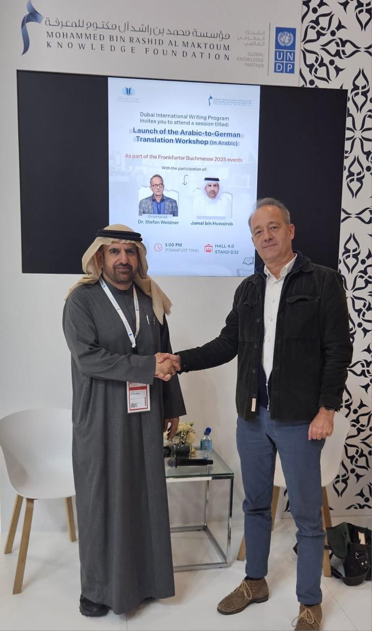 Dubai, UAE, 17 October 2025- The Mohammed bin Rashid Al Maktoum Knowledge Foundation (MBRF) unveiled the ‘Arabic-German Translation Workshop’ during its participation at the Frankfurter Buchmesse 2025. This initiative marks a key milestone in the global expansion of its Dubai International Program for Writing (DIPW) initiative. The workshop aims to enhance the presence of Arabic books in the German knowledge landscape and bridge the gap between the two languages by translating selected Arabic works into German.